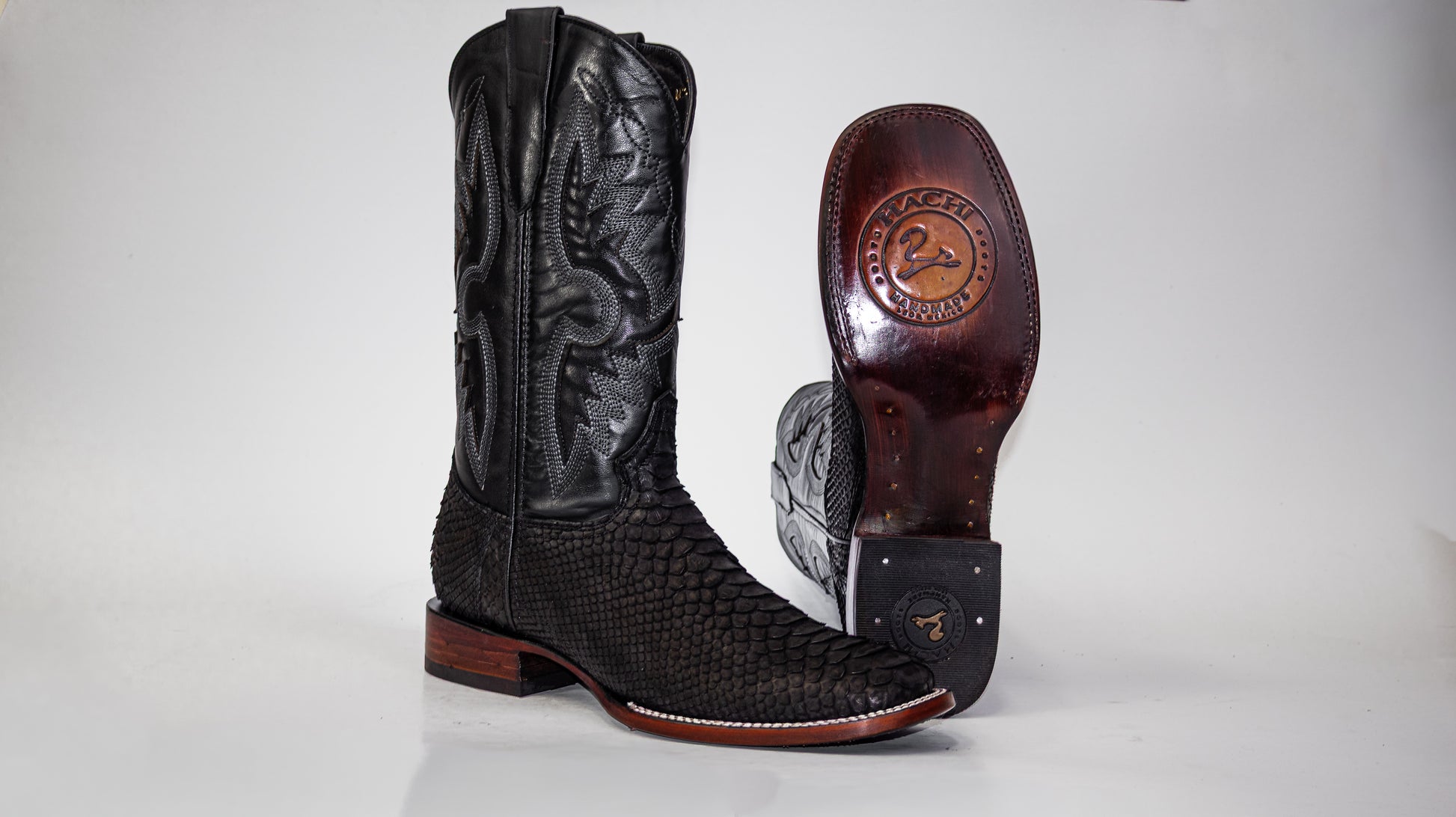 Autenthic Black Python Cowboy Boot, Square Toe, Leather Sole and Heel